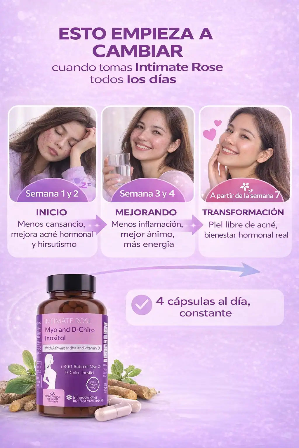 Los primeros cambios se sienten entre 3 y 4 semanas, y los resultados más claros con uso constante a partir de 8 semanas.